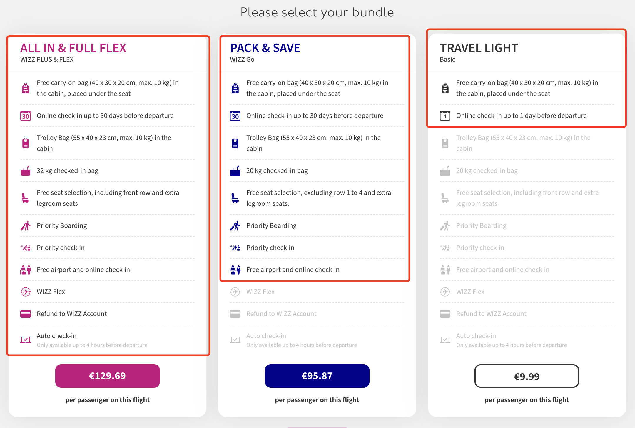 Free carry-on bag (40 × 30 × 20 cm, max. 10 kg) in the cabin, placed under the seat