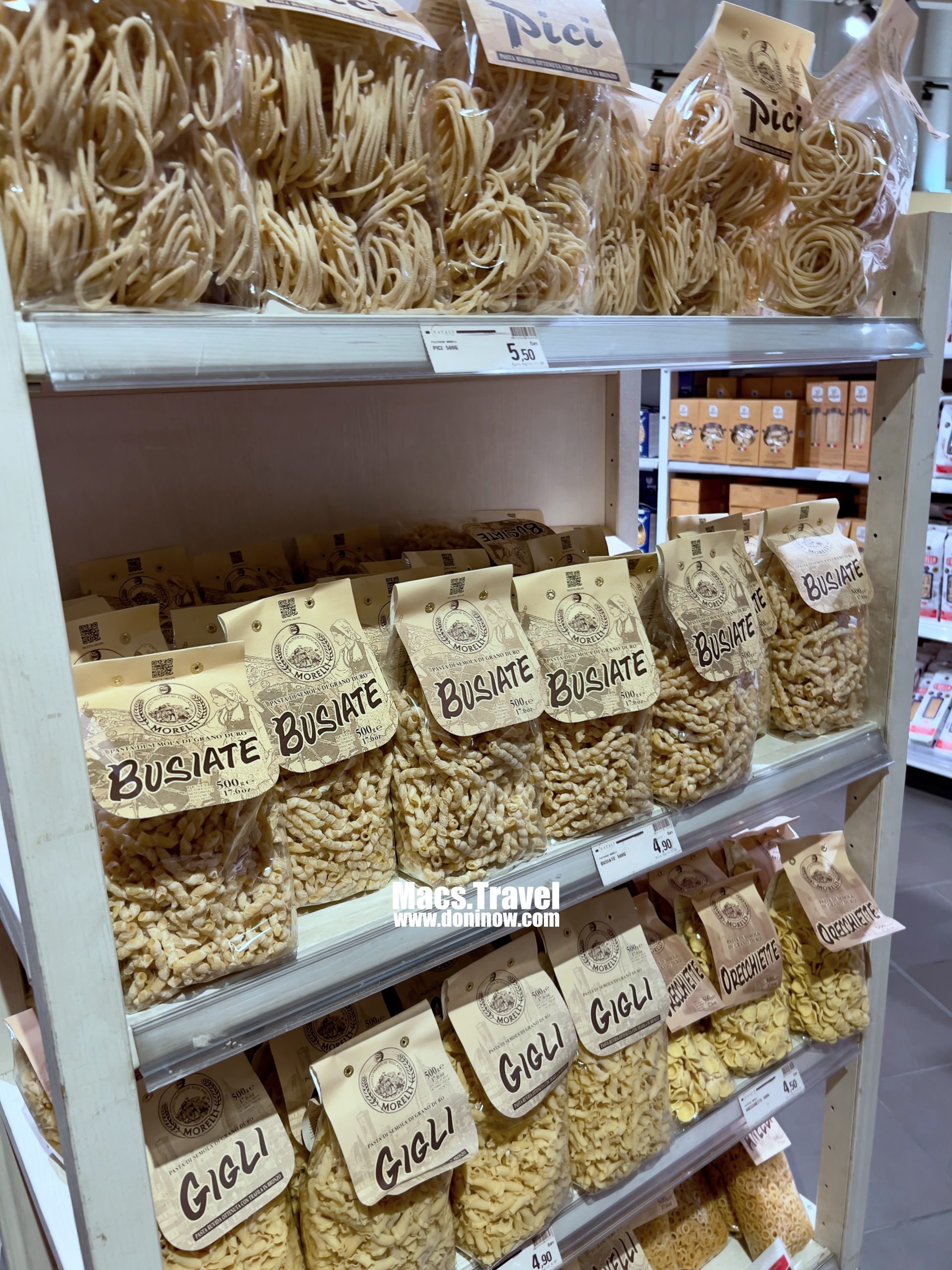 두 번째는 파스타 면입니다. 한국에서는 보기 힘든 다양한 면이 존재하는데요. 기념품으로 사다주기에도 적당한 가격입니다. 생각보다 단단해서 짐 안에 넣어놔도 면은 안 부서져요. 단 삐쭉한 파스타면에 봉투가 상할 수 있으니 이점은 유의하시면 좋을 거 같아요. 들고 갔는데 봉투가 터져서 줄줄 새면 마음 아프잖아요 ㅠ