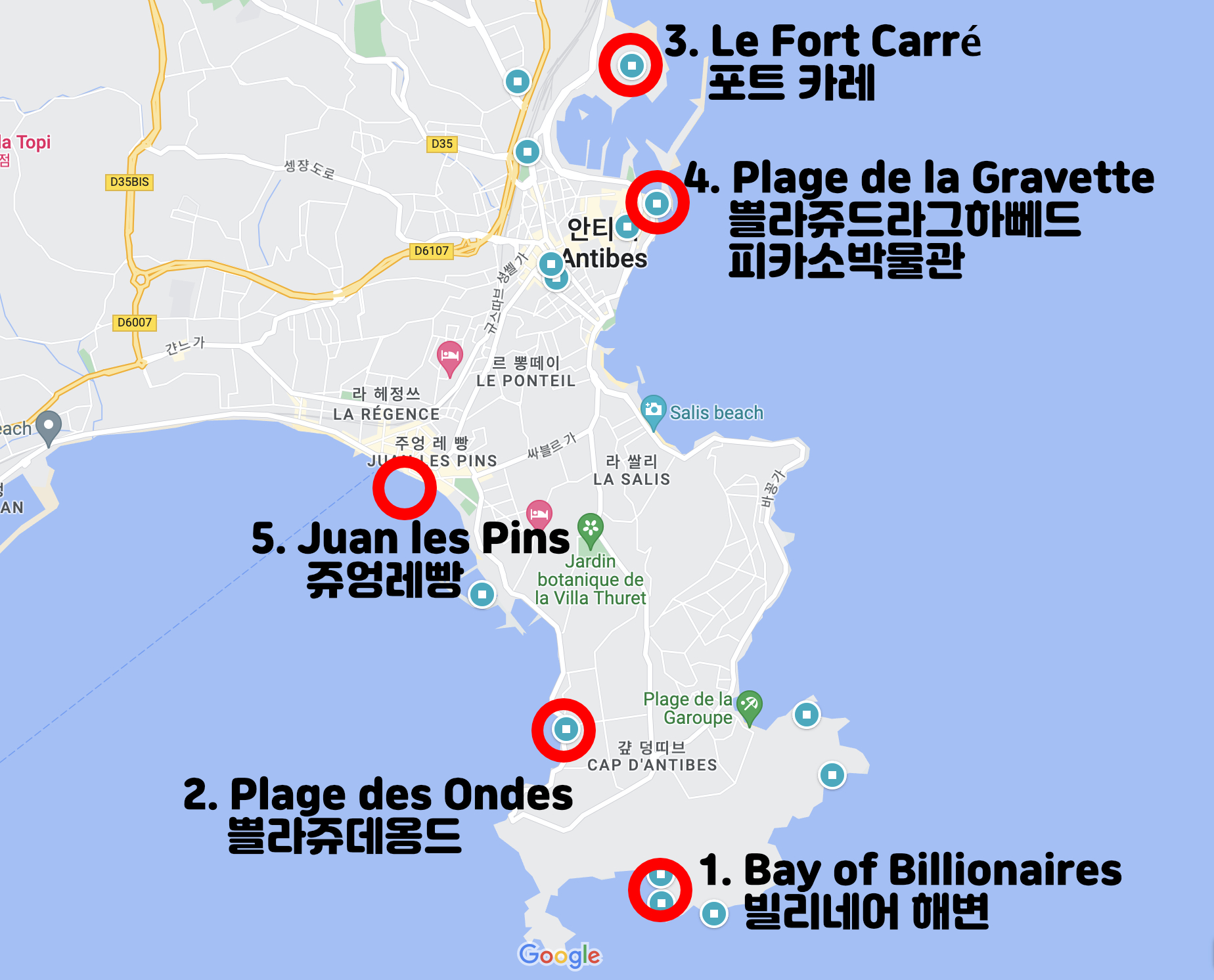 순서는 제가 앙티브에서 좋아했던 곳들로 뽑았습니다. 1등부터 5등까지 순서대로 가봐야할 곳들로 모아봤습니다.