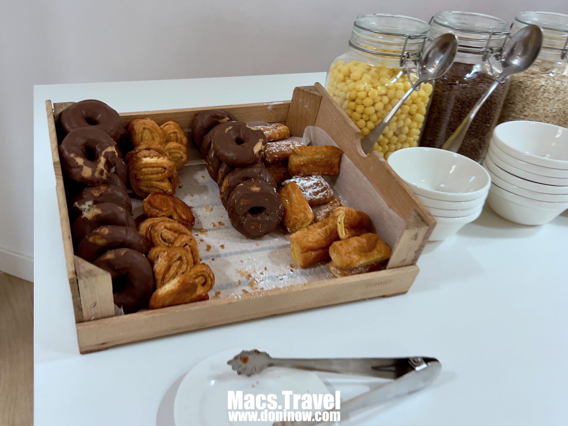 다양한 커피 종류를 만들 수 있는 머신이 배치되어 있습니다. 또 옆에 시리얼과 우유, 차종류도 다양하게 있습니다.