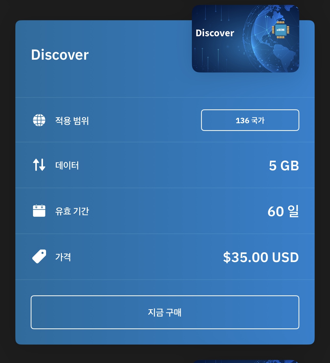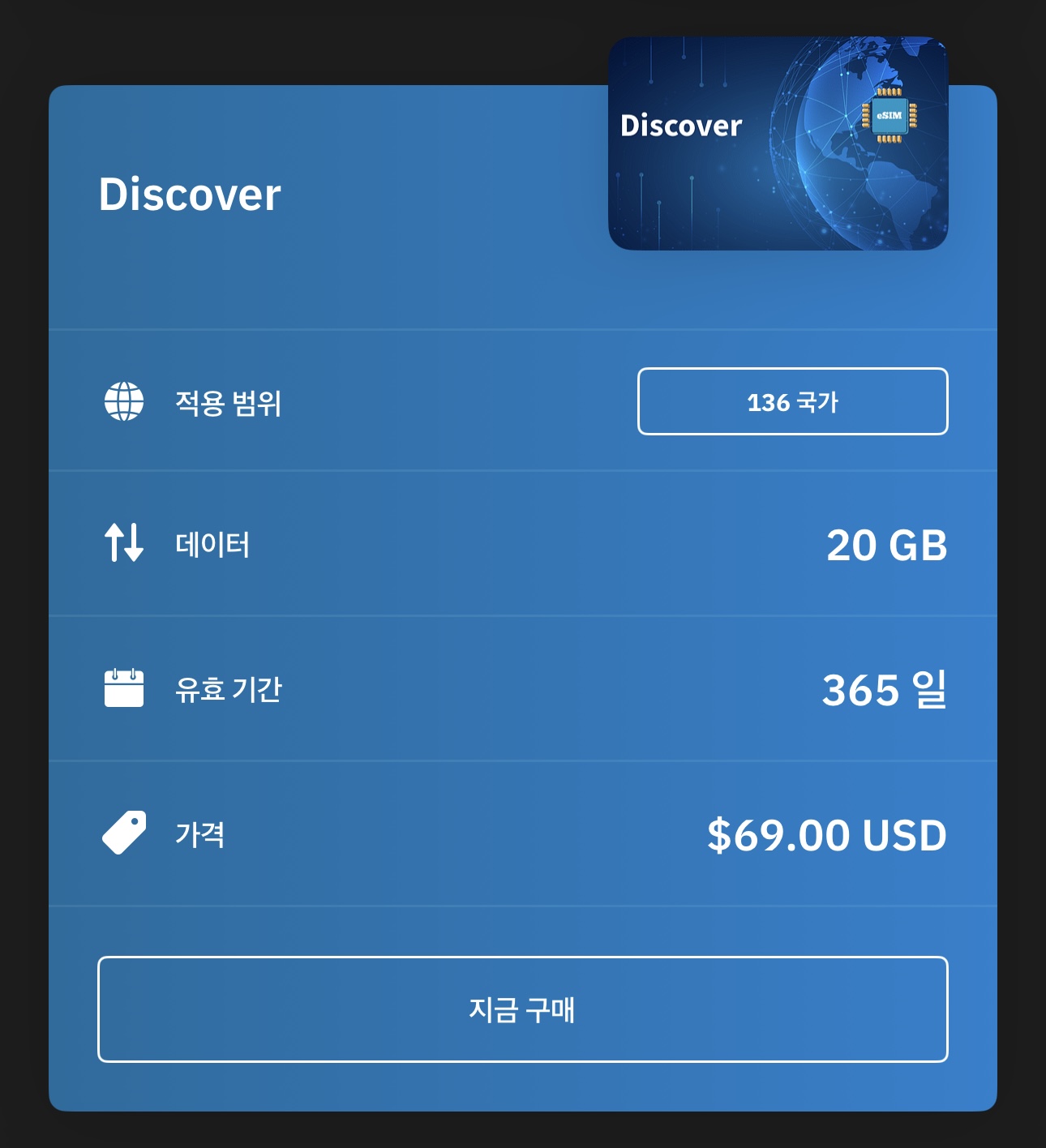제가 사용하는 플랜은 1년 365일 136개국 지원 20기가 플랜입니다. 20기가 1년 사용이라면 "어라 적은데?"라고 생각하실 분도 계시겠지만 제가 사용하는 방식은 데이터는 필요할 때만 사용하고 나머진 와이파이에서만 사용합니다. 쇼츠만 안 봐도 블로그 하나는 더 쓰게 되더라고요 :) 대략 한 달에 2기가씩 사용하면 10개월, 3기가씩 사용하면 약 7개월을 사용할 수 있습니다.