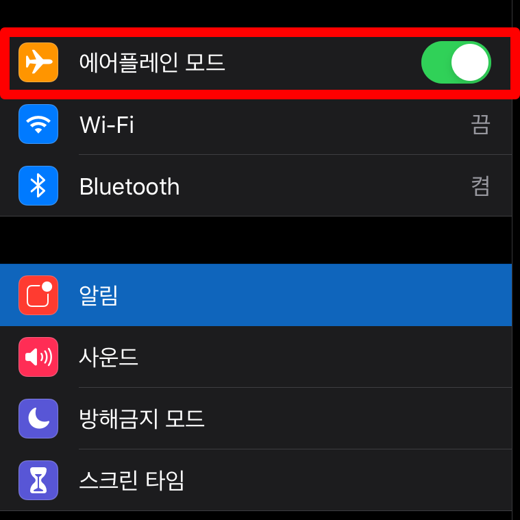 에어플레인 모드를 켜면 항상 붙어있던 와이파이나 셀룰러 모드가 종료하게 됩니다. 사용하지 않을 때는 에어플레인 모드가 가장 쉽게 배터리를 절약하는 방법이기도 합니다.