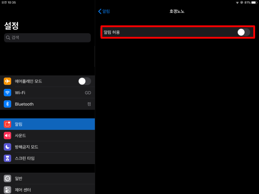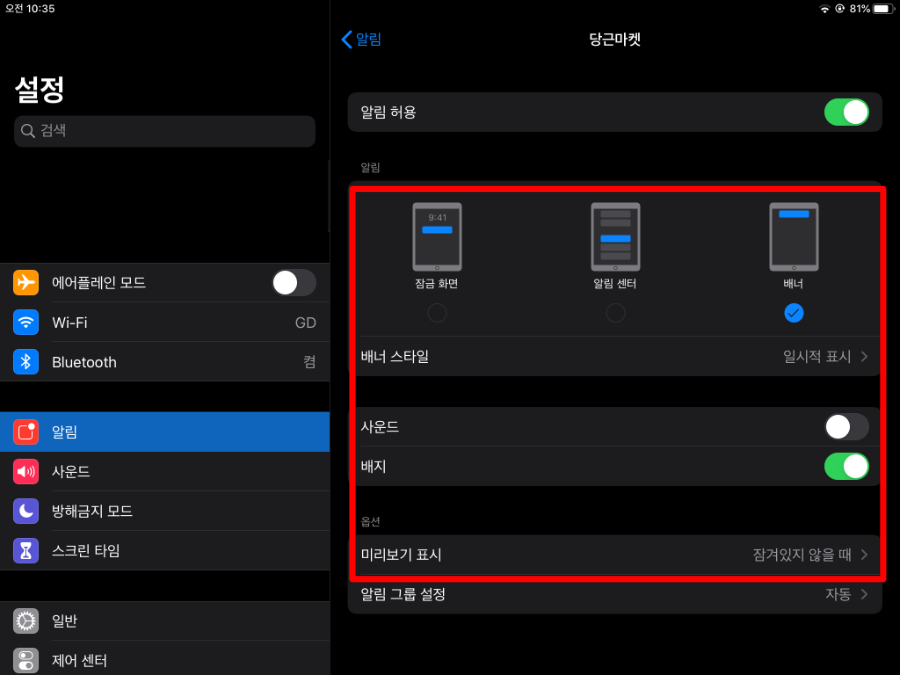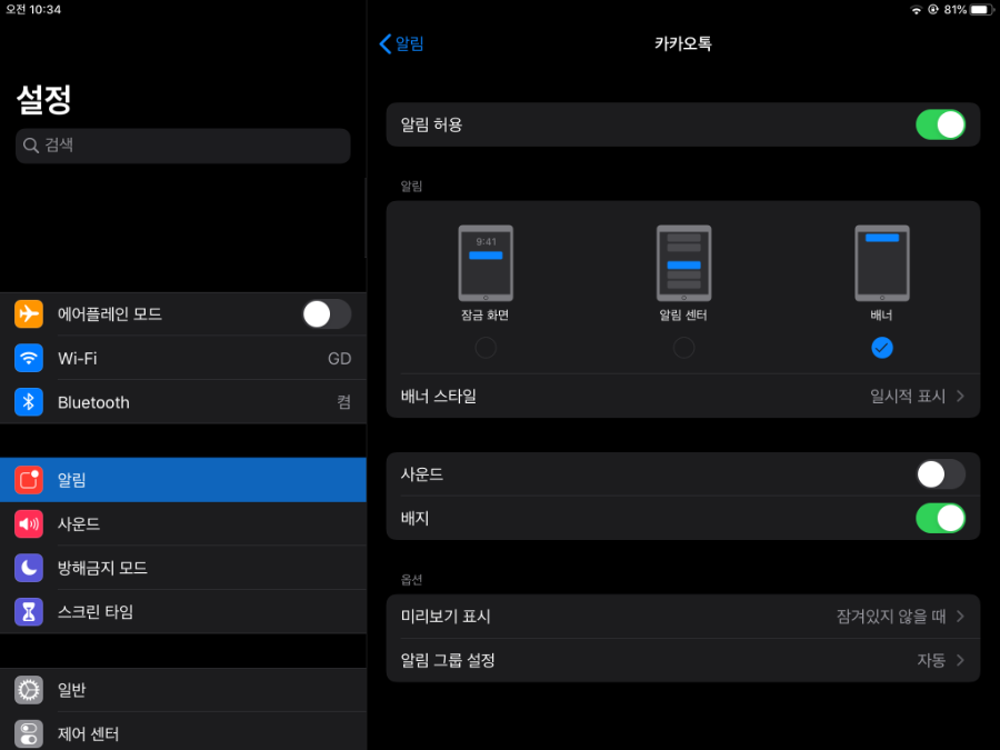 알림에서 보시면 다양한 앱들마다 개별적인 설정을 할 수 있습니다. 카카오톡 같은 경우는 아이폰으로 바로 알림을 받아보니 잠금화면에서 알림을 끄고, 사운드도 꺼놨습니다. 요즘 자주쓰는 당근마켓도 그렇게 설정했고요. 호갱노노 같은 앱은 그냥 알림을 껐습니다. 직접 들어가면 알림이 뜹니다.