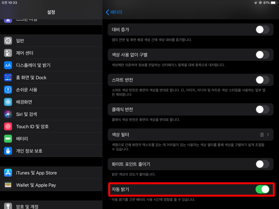-자동 밝기 켬으로 조도센서에 의해 화면 밝기 자동 조절