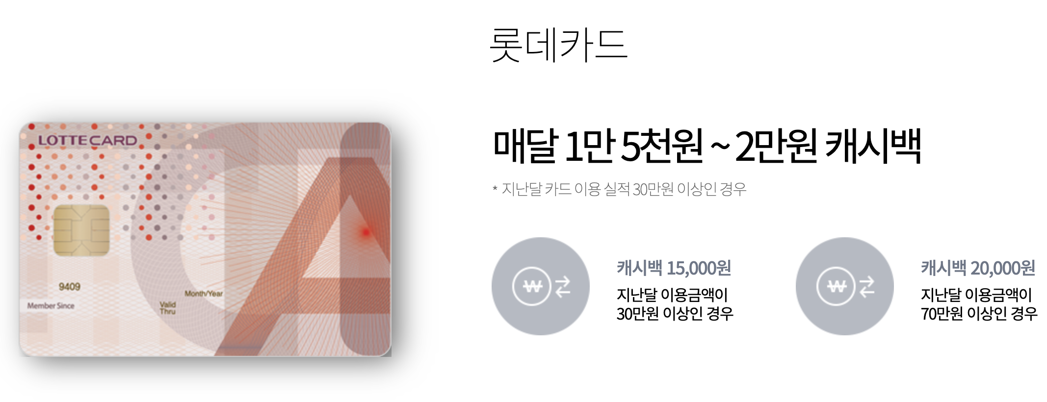 현재 유플러스 카드 할인으로 제휴된 카드는 롯데카드입니다. 전화해서 확인해본 결과 자사 사이트를 통해서만 발급될 때만 할인이 제공된다고 합니다. 월 30만 원 이상 카드 사용 시 15,000원이 할인되니 약 18,000원에 무제한 요금을 사용하는 것과 같습니다.