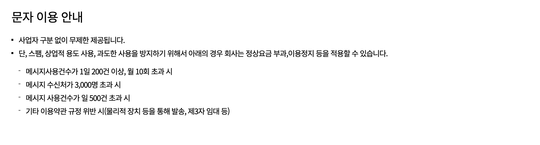 메시지도 무제한으로 이용이 가능하나 유플러스 측에서 매일 200건 이상의 발송이나 3000명이 넘는 사용자에게 발송할 시, 제한을 걸 수 있다고 명시하고 있습니다.