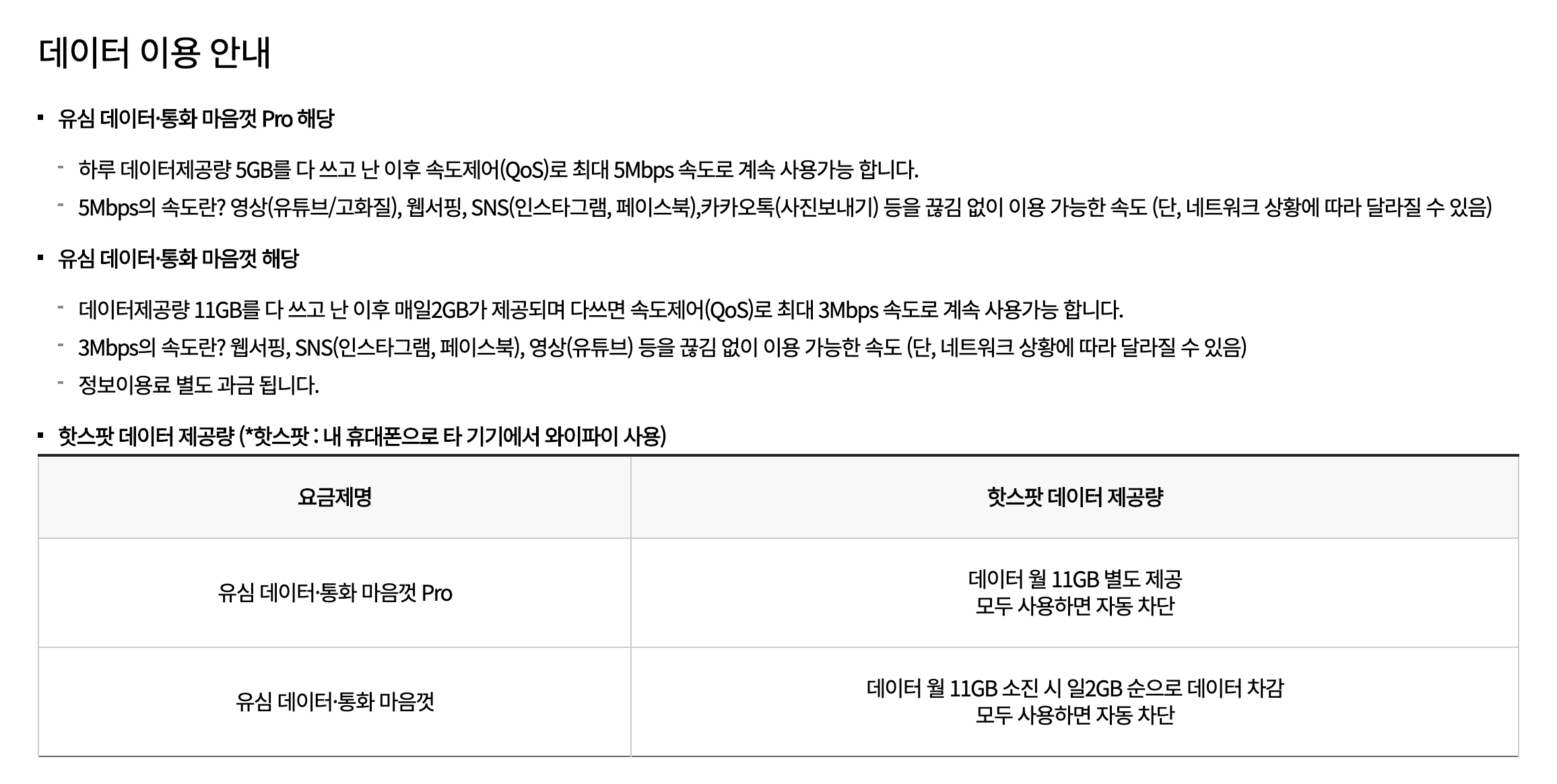 한 달에 속도 제한 없는 11기가의 데이터 용량이 주어지고 모두 사용 시 하루 2기가의 용량을 지급합니다. 2기가를 모두 소진하여도 3Mbps의 속도로 무제한 이용이 가능합니다.