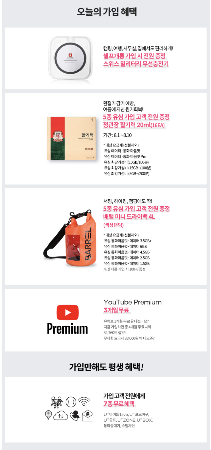 현재 유플러스 알뜰 모바일에서는 다양한 사은품으로 고객을 유도하고 있습니다. 재고 수량이 소진하면 바뀌는 방식이라 현재 포스팅할 때 기준으로 제공되는 상품은 다음과 같습니다. 스위스 밀리터리 무선충전기, 정관장 활기력, 배럴방수팩, 유튜브프리미엄3개월. 다만 전상품 지급은 셀프 개통 시에만 지급되니 꼭 셀프 개통을 통해 개통하시길 바랍니다.