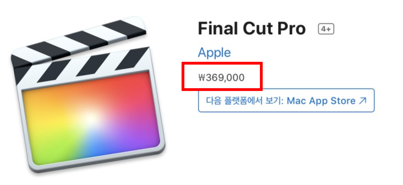 일반적으로 애플의 앱은 앱스토어에서 직접 구매하거나 다운로드가 가능합니다. 현재 판매 가격은 369,000원 이군요. 프리미어와 다르게 한번 결제하면 평생 무료지만 비싼 건 사실입니다. 또한 파이널 컷 이외에 심화과정을 들어가신다면 모션과 컴프레서도 필요하기 때문에 개별적으로 구매하면 상당히 큰돈이 깨질 겁니다.