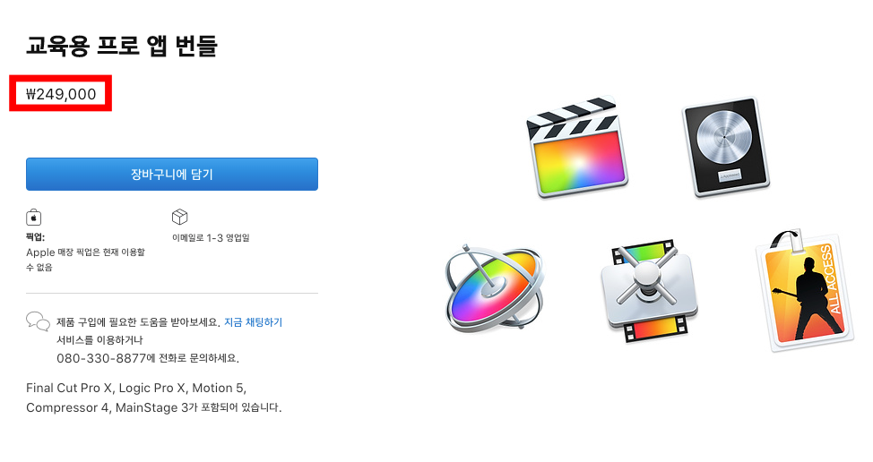 애플은 공식 홈페이지에서도 교육 할인 스토어를 운영하고 있습니다. 교육 할인이라고 해서 학생만 할인해주는 건가 싶지만 구매 시 따로 인증절차는 필요하지 않습니다. 교육용 프로 앱 번들에는 영상을 위한 파이널 컷 프로, 모션, 컴프레서가 포함되어있고 음악을 위한 앱으로는 로직과 메인 스테이지가 포함되어 있습니다. 개별적으로 구매 시 모두 비싼 제품입니다.