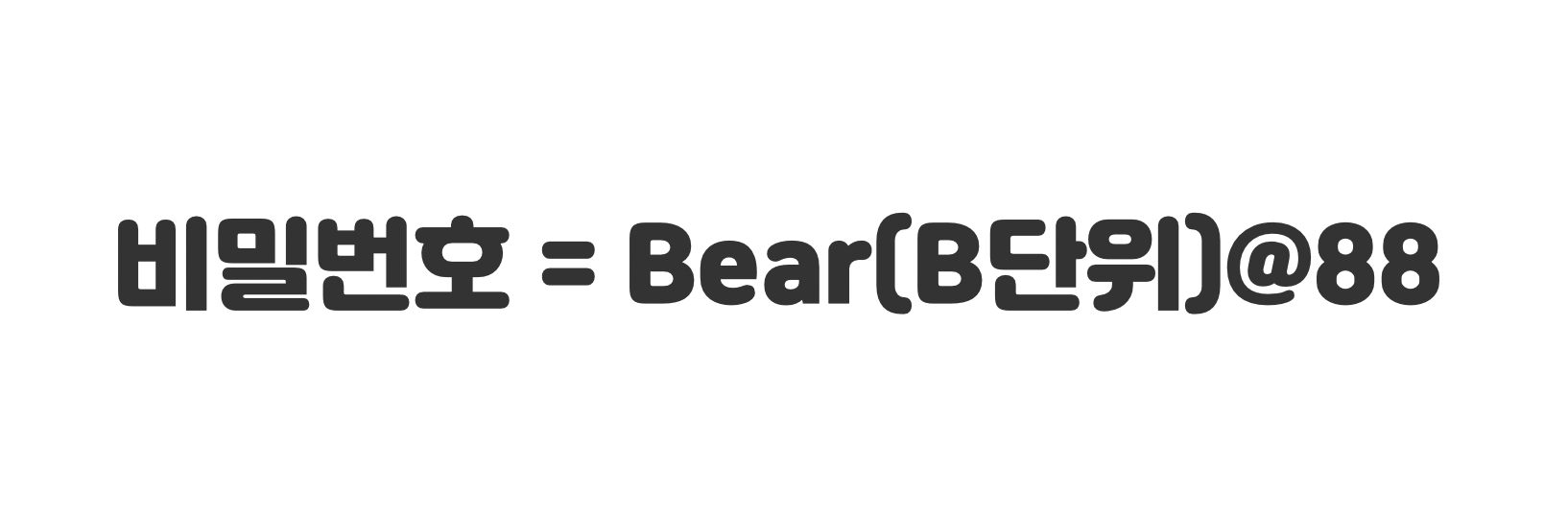 예를 들면 제 별명이 아주 귀여운(?) 곰이라고 합시다. 그러면 A 단위에는 Bear 첫 문자 대문자와 소문자로 구성된 단어를 하나 정했습니다. 그리고 C단위에 @88이라는 숫자와 특수문자를 정했다고 가정합시다. 그러면 비밀번호를 이런 구성이 될 겁니다.