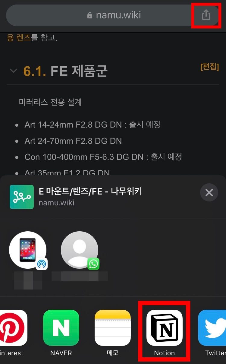 웹페이지에서는 상단의 웹 클리퍼로 링크 수집이 가능지만 모바일에선 공유 버튼을 통해서 바로 저장이 가능합니다. 공유하기 버튼을 누르시고 하단에 확인하시면 노션 앱이 있습니다. 바로 저장이 가능합니다.
