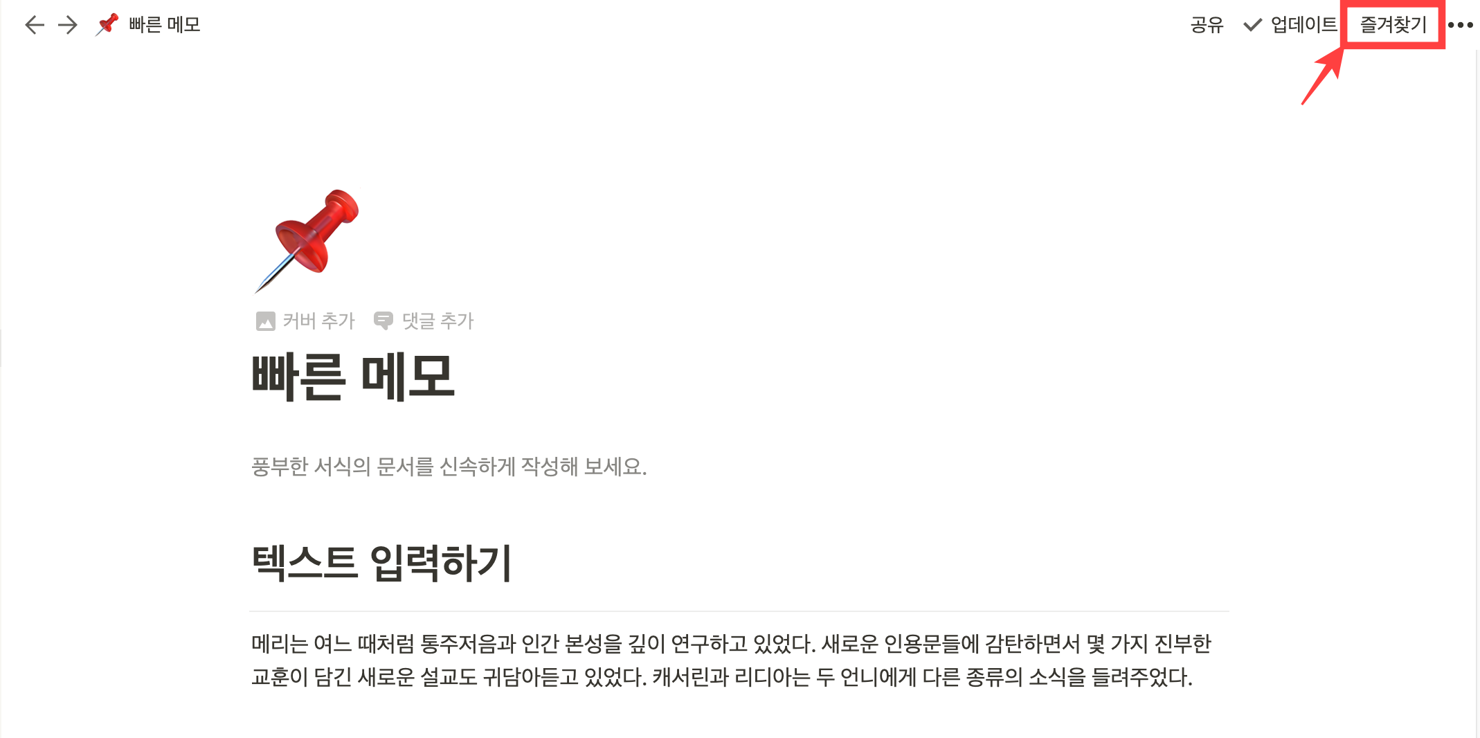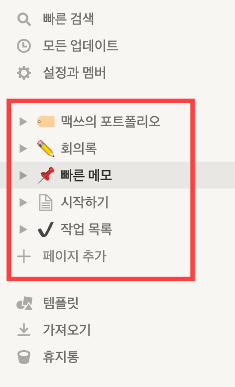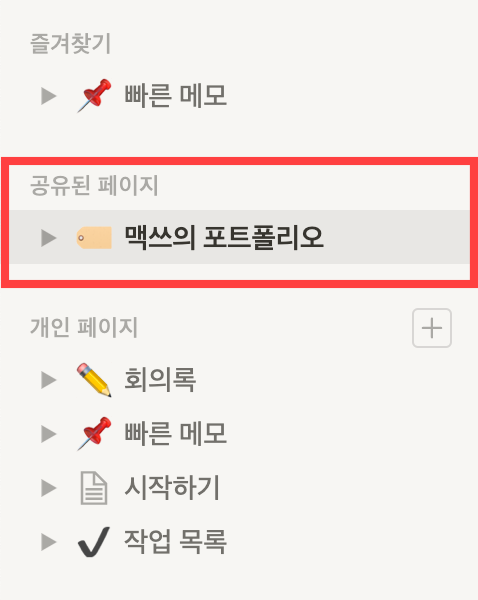 자신이 만드는 모든 페이지는 자동으로 개인 페이지 섹션으로 들어갑니다. 개인 페이지에서 즐겨찾기를 등록하면 개인 페이지에 페이지는 이동하지 않고 개인 페이지와 즐겨찾기 두 곳에 남아있습니다. 생성된 개인 페이지는 모두 이곳에 있다고 생각하시면 됩니다.