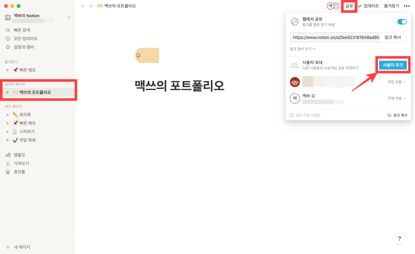 공유를 거는 방법은 해당 페이지 우측 상단에 공유 메뉴에서 가능합니다. 지정된 사용자를 걸었을 때만 공유 섹션으로 넘어갑니다. 그냥 공개페이지로 만드는 건 공유된 페이지로 들어가지 않는다는 점 참고하세요.