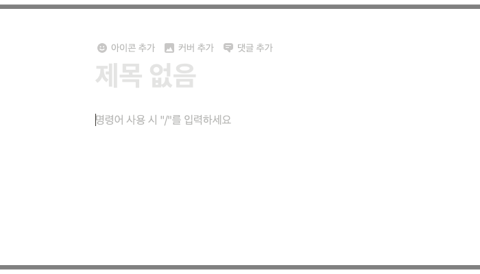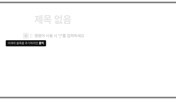 처음 페이지를 만들고나면 이러한 화면이 나올 겁니다. 다음 화면에서 +를 클릭하거나 명령어를 사용하고 싶으면 /입력 후 블록명을 입력하면 됩니다.