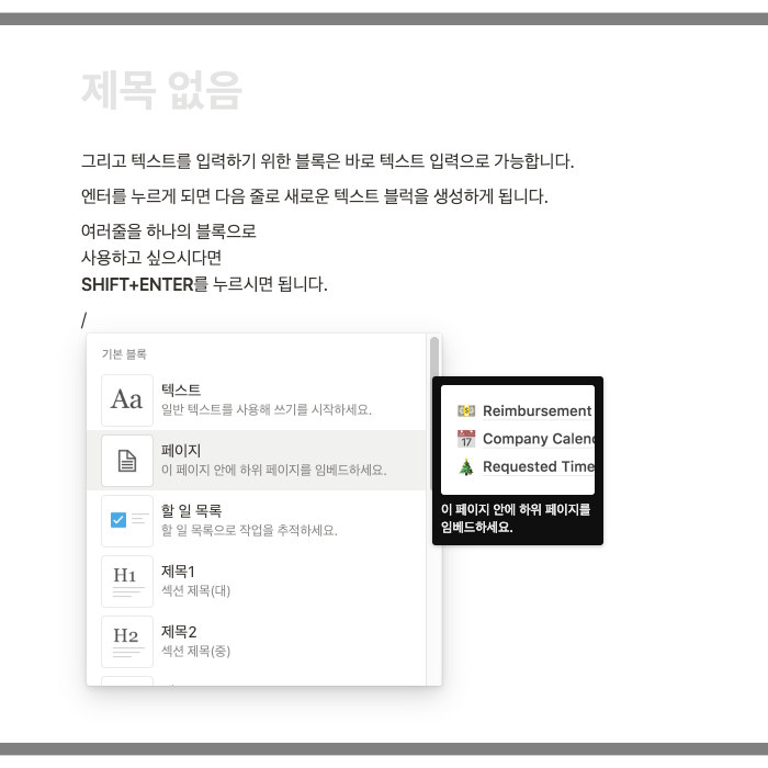 노션에서는 페이지 안에 여러 페이지를 생성이 가능합니다. 블록 목록에서 페이지를 클릭하거나 /페이지 를 입력하시면 새로운 페이지가 생성됩니다.