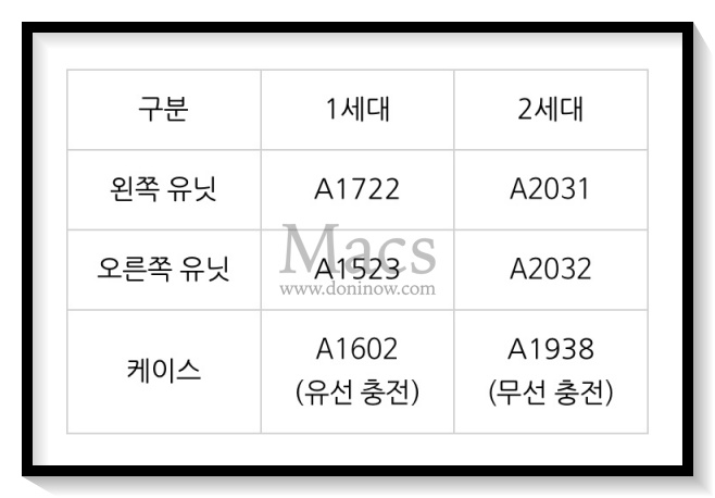 ▲에어팟 1세대 2세대 모델명 한장요약