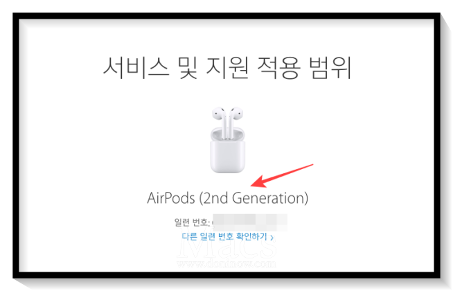 그러면 박스도 없고 무선 케이스도 아닌 유선 케이스라면 어떻게 구분을 해야 할까요. 그럴 땐 일련번호로 애플 서비스 지원을 조회해보면 다음과 같이 표시됩니다.